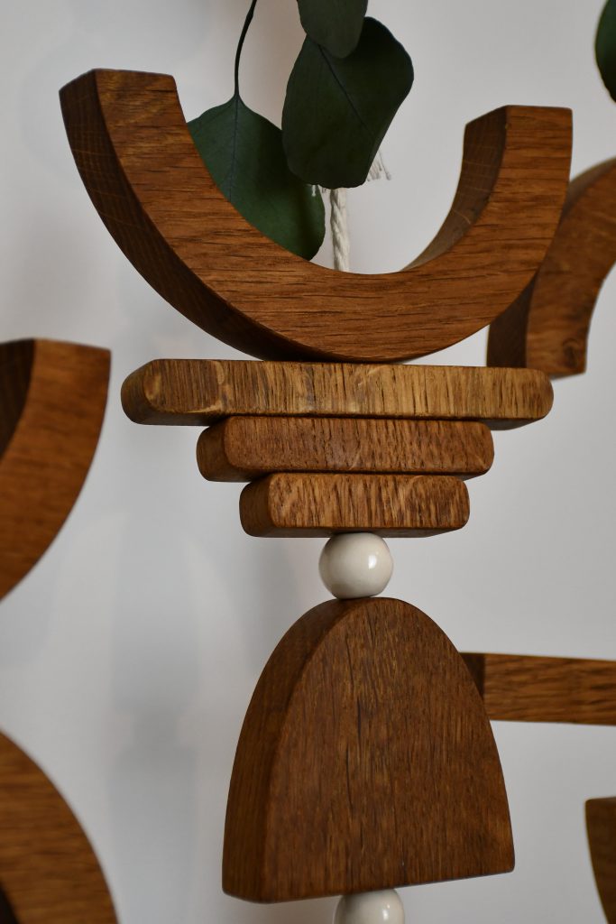 Matériaux de Qualité : Les To[t]ems sont fabriqués à partir de chêne de haute qualité, ornés de perles en faïence et de cordes de coton, fermé par des morceaux en laiton revalorisé provenant d’un atelier de bijoutier. Chaque détail est soigneusement travaillé pour créer une pièce d’art authentique et unique.